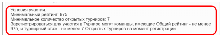 в Панели управления турниром означает, что ваша команда в данный момент не может зарегистрироваться в этот турнир, поскольку не выполняет требования по минимальному значению Рейтинга или Стажу команды (количеству сыгранных турниров).