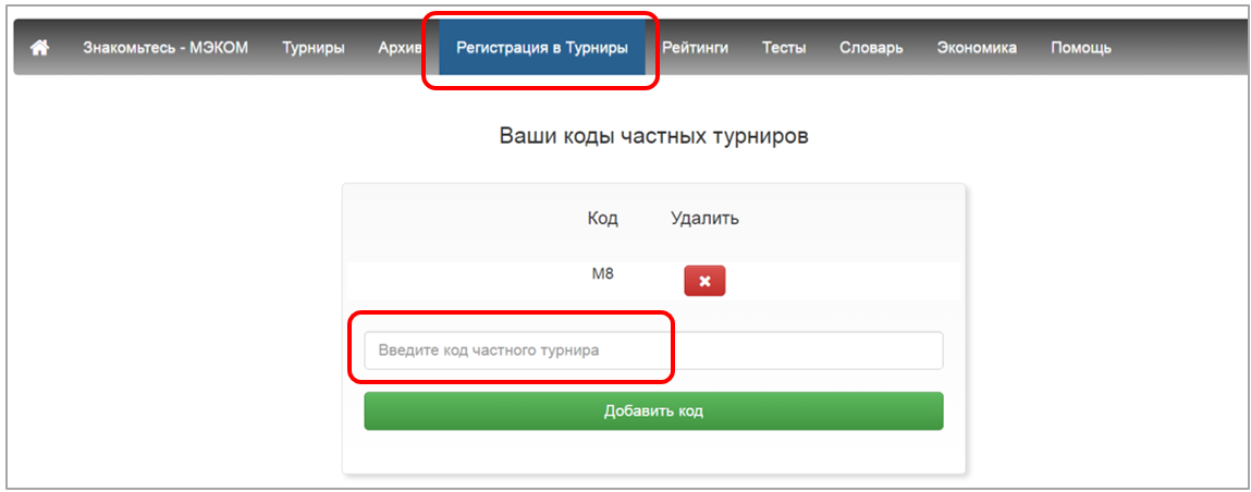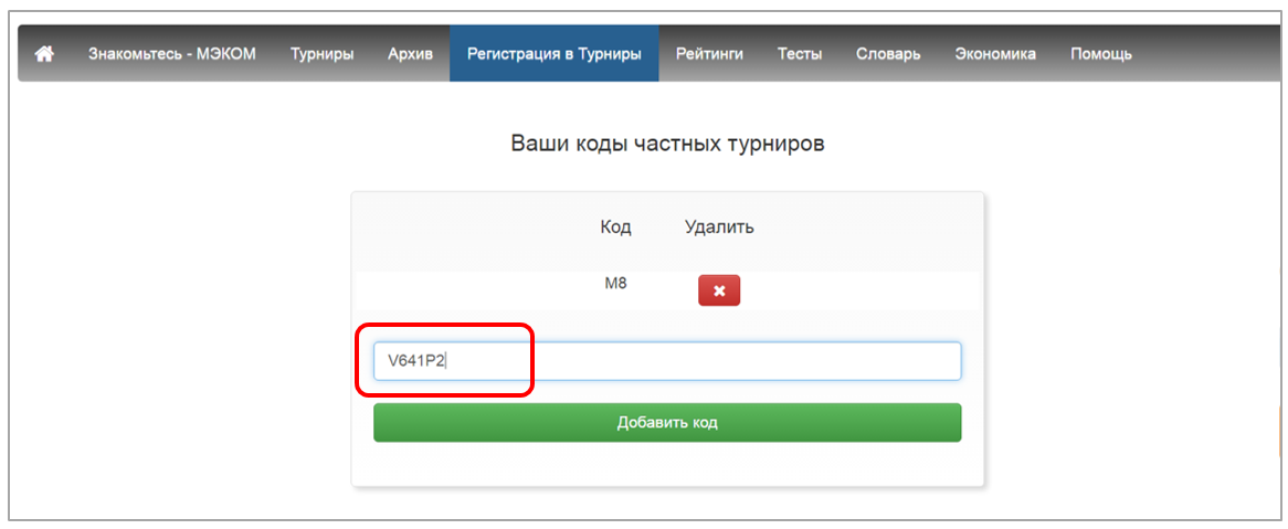 Введите код, который Вы получили от Организатора турнира и нажмите кнопку «Добавить код»