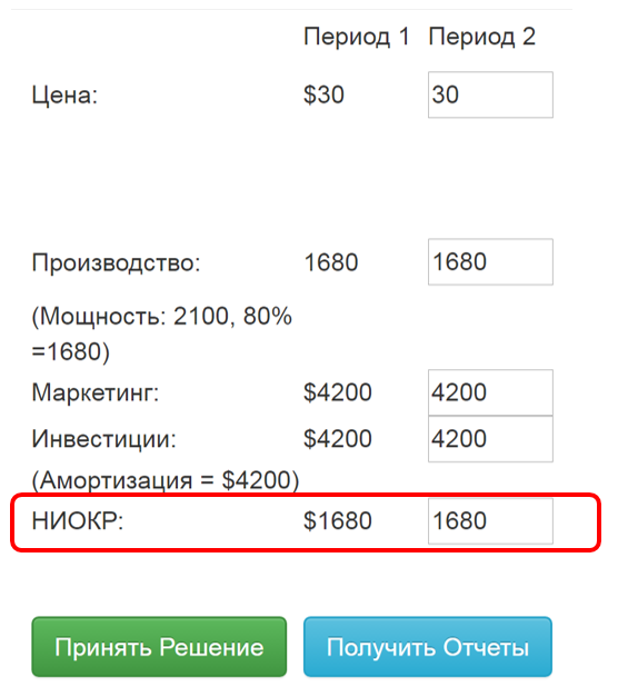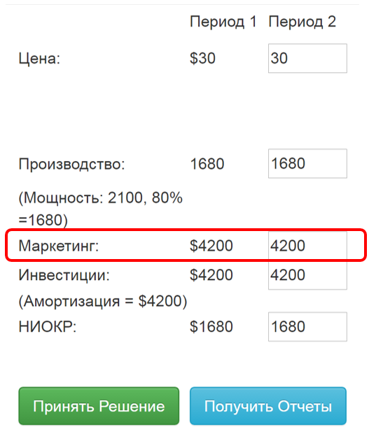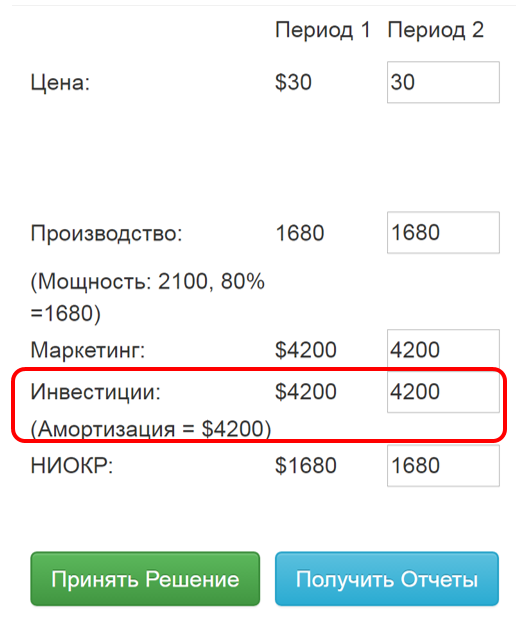 По результатам решений, принятых в предыдущих периодах, у каждой Фирмы формируется Мощность фабрики – максимальное количество продукции, которое может быть произведено Фирмой в данном периоде.